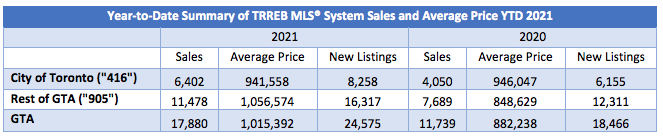 The average price fell just below $1 million in Toronto, at an average of $995,201. The rest of the GTA, however, sat at a $1,071,512 average price point.