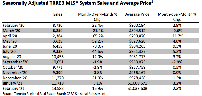 According to a new report from the Toronto Regional Real Estate Board (TRREB), the average Toronto home price in February reached $1,045,488. This is a month-over-month increase of a whopping 14.9%.